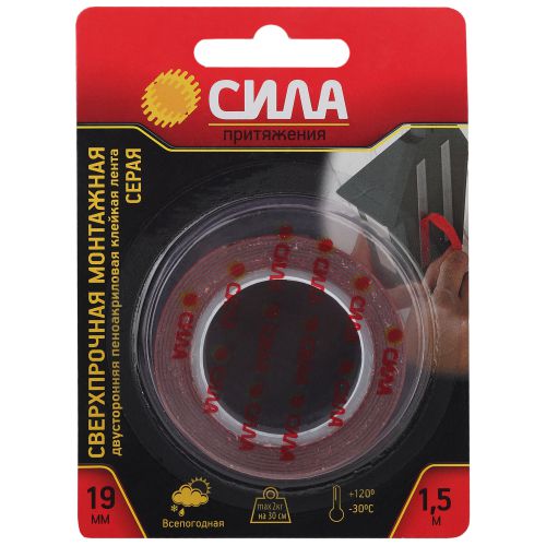 Лента клейкая сверхпрочная монтажная SDST-1915GR двустор. пеноакрил.19мм х 1.5м сер. СИЛА Б0046372