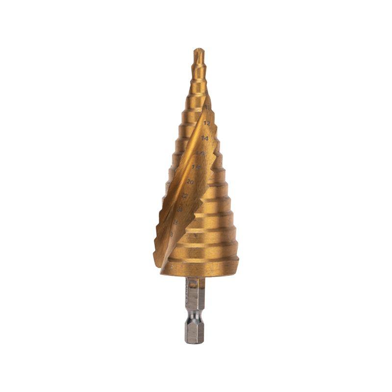 Ступенчатое сверло KRANZ применяется при выполнении монтажно-сборочных работ для сверления отверстий различных диаметров без перестановки режущего инструмента. Применяется в работе с такими материалами, как пластик, дерево, металл и др. Благодаря своей уникальной конструкции изделие заменяет целый набор традиционных спиральных сверл. Использование оснастки позволяет сэкономить время мастера, так как не требует предварительного кернения и сверления. Шестигранный хвостовик Е6,3 обеспечивает надежную фиксацию сверла во всех типах патронов шуруповертов и дрелей. Форма канавки – спиральная. На каждой из 15 ступеней сверла нанесена маркировка фактического диаметра. Диапазон ступеней: 4, 6, 8, 10, 12, 14, 16, 18, 20, 22, 24, 26, 28, 30, 32 (шаг 2 мм). Сверло изготовлено из стали М2 (Р6М5) и обладает высокой прочностью, а также устойчивостью к динамическим нагрузкам и перегреву. Покрытие из нитрида титана (TiN) обеспечивает стойкость инструмента к коррозии и перегреву при сверлении.