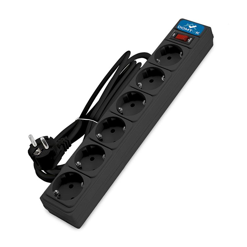 Удлинитель с сетевым фильтром 6х3м с заземл 10А IP20 2.2кВт ПВС 3х1 с выкл. черн. DOMTOK 2522