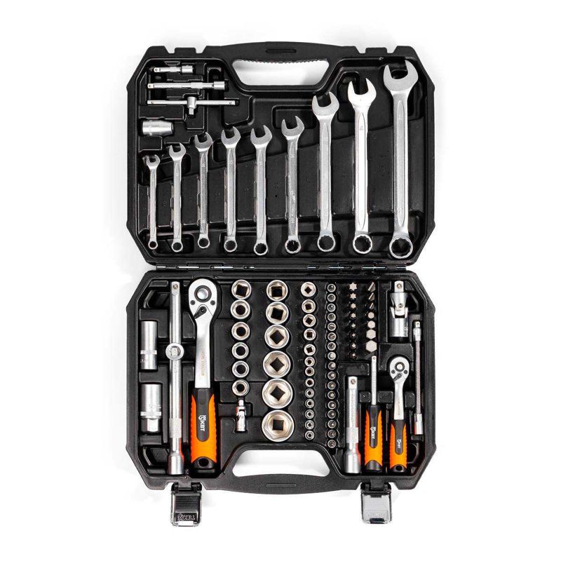 • Набор инструмента из 82 предметов для проведения авторемонтных, слесарных и сантехнических работ • Состав набора: • КОМПЛЕКТ 1/2" • Головки торцевые шестигранные: 14; 15; 16; 17; 18; 19; 20; 22; 24; 27; 30; 32 мм • Универсальный шарнир • Ключ-трещотка, 72 зубца • Адаптер для удлинителя 3/8"(F)х1/2"(М) • Головки свечные: 16; 21 мм • Удлинитель: 125; 250 мм • Гибкий удлинитель • Биты 30 мм: T40, T45, T50, T55 / FD (SL): 8, 10, 12 / PZ: 3, 4 / PH: 3, 4 / HEX: 8, 10, 12, 14 мм • КОМПЛЕКТ 1/4" • Головки торцевые шестигранные: 4; 4.5; 5; 5.5; 6; 7; 8; 9; 10; 11; 12; 13; 14 мм • Ключ-трещотка, 72 зубца • Вороток Т-образный 115 мм • Вороток отвертка • Универсальный шарнир • Удлинитель: 50; 100 мм • Обойма-держатель для бит • Биты 30 мм: T8, T10, T15, T20, T25, T30 / FD (SL): 4, 5.5, 7 / PZ: 1, 2 / PH: 1, 2 / HEX: 3, 4, 5, 6 мм • Ключи комбинированные: 8; 10; 11; 12; 13; 14; 17; 19; 22 мм • Пластиковый кейс • Материал торцевых головок: хром-ванадиевая сталь • Покрытие: матовое никелирование • Габариты кейса: 395х300х95 мм • Вес набора: 6.0 кг