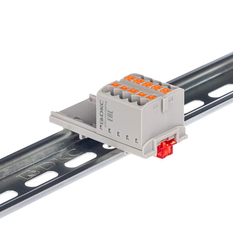Главная/ Каталог / Колодки клеммные / Проходная клеммная колодка / Блок распределительный с вертикал. адаптером на рейки шир. 15/35мм зажим push-in 10 точек подключения 2.5кв.мм сер. DKC DTP1-010-04SPUG-V