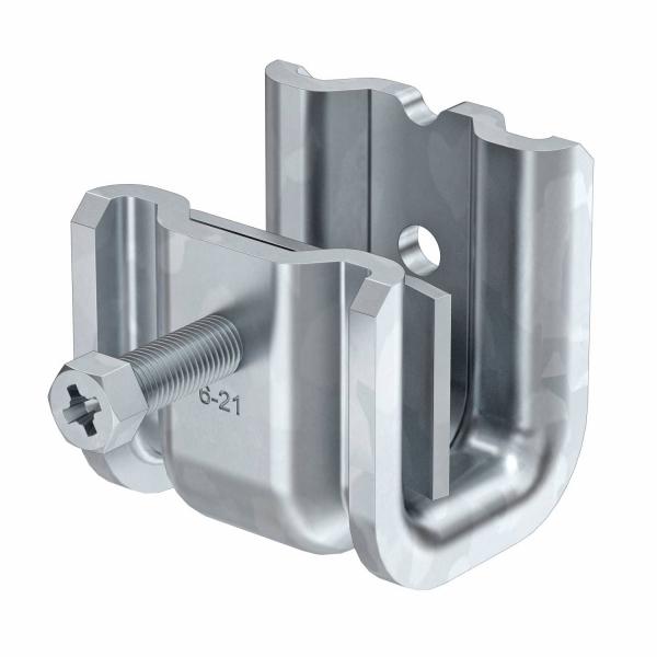 Этот вид балочного зажима устанавливается на опору и фиксируется с помощью прижимной пластины и винта (M8) на опоре или полосовой стали. Болт имеет ширину 10 мм. В корпусе скобы имеется также 2 резьбы M6, например, для крепления стержня с резьбой.