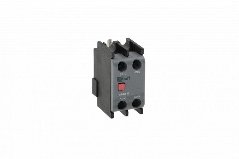 Приставка контактная серии ПКЛ-02-11 для контакторов КМ-102 Dekraft; кол-во контактов - 1НО и 1НЗ; ном.ток 10 А; ном.напряжение до 690 В; установка с лицевой стороны; степень защиты IP20. Приставки контактные предназначены для увеличения количества вспомогательных контактов контактора. Контактные приставки механически соединяются с контакторами и фиксируются при помощи защелки. Приставка подходит для использования с контакторами других производителей.