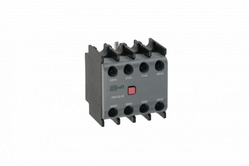 Приставка контактная серии ПКЛ-02-13 для контакторов КМ-102 Dekraft; кол-во контактов - 1НО и 3НЗ; ном.ток 10 А; ном.напряжение до 690 В; установка с лицевой стороны; степень защиты IP20. Приставки контактные предназначены для увеличения количества вспомогательных контактов контактора. Контактные приставки механически соединяются с контакторами и фиксируются при помощи защелки. Приставка подходит для использования с контакторами других производителей.