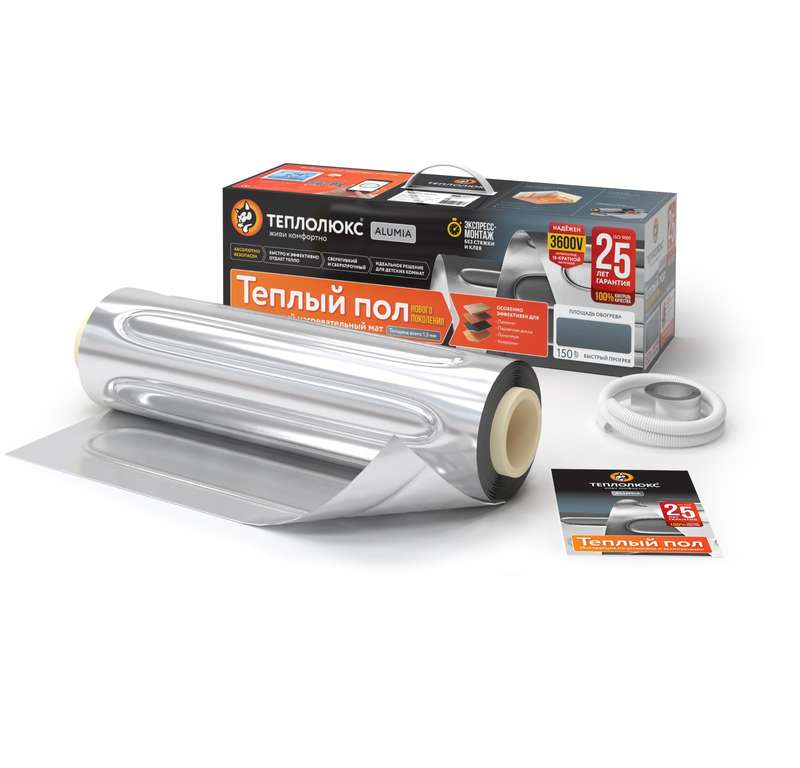 Теплолюкс ALUMIA - тоньше кабеля, надежней пленки. Мощность 150 Вт/м? Диаметр кабеля 1,08-1,49 мм Ширина 0,5 м Гарантия 25 лет Предназначен для устройства комфортного подогрева пола без заливки строительными смесями и устанавливается непосредственно под напольное покрытие, гарантируя тепло и комфорт в помещении любого типа. Укладывается под быстро устанавливаемые декоративные покрытия - идеальный теплый пол под ламинат, паркетную доску, линолеум или ковролин. Теплолюкс Alumia сочетает все достоинства кабельных и пленочных теплых полов: - сухой монтаж без стяжки - не поднимает уровень пола - все соединения выполнены в заводских условиях с необходимыми этапами контроля - максимально быстрый монтаж – разложи и подключи терморегулятор (без монтажа соединений) - готово к использованию сразу после укладки - фольга равномерно распределяет тепло, экранирует электромагнитное излучение - нагревательный мат заземлен и электрически безопасен