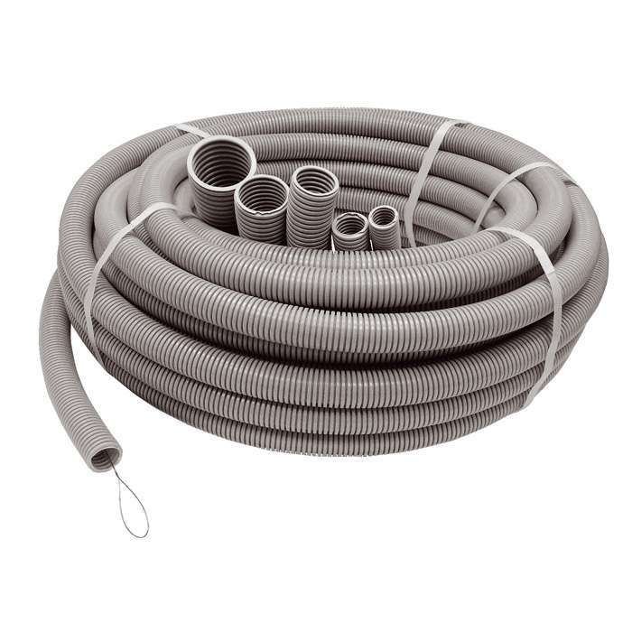Главная/ Каталог / Системы защиты шланговые / Труба гофрированная пластиковая / Труба гофрированная ПВХ легкая d20мм с протяжкой сер. (уп.20м) Ruvinil 12001(20)