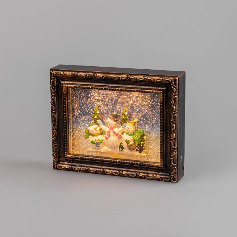 Декоративный светильник «Картина» с эффектом снегопада и подсветкой — прекрасный подарок к Новому году или Рождеству, который порадует и детей, и взрослых. Прозрачная колба наполнена жидкостью с металлизированным конфетти, которая начинает циркулировать сразу после включения. Сверкающий вихрь блесток уносит зрителей в волшебную зимнюю сказку, где главные герои — компания снеговиков — фигурки, стоящие в центре. Светильник работает от 4-х элементов питания типа АА, что дает возможность использования в любом удобном месте. USB-шнур входит в комплект. В случае потери или порчи шнура питания из комплекта в качестве замены использовать шнур 18-0235.