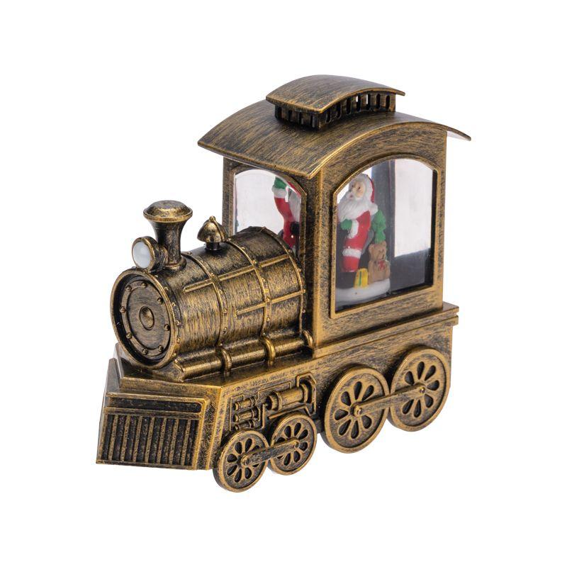 Декоративный фонарь Паровоз — великолепное интерьерное украшение, символизирующее Новый год и Рождество. Светильник с эффектом снегопада и подсветкой выполнен в бронзовом цвете, внутри находится фигурка Санта Клауса. Портативный фонарь питается от 3-х батареек типа АА или через USB-кабель с сетевым адаптером. Вьюга, создаваемая сверкающими блестками, кружится внутри колбы и подсвечивается теплыми белыми диодами. Декоративный фонарь станет прекрасным подарком детям и взрослым, принесет атмосферу зимней сказки в ваш дом.
