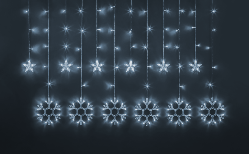Главная/ Каталог / Светильники / Освещение иллюминационное / Гирлянда светодиодная "Бахрома" "Звезды и снежинки" 95 121 NGF-D032-02 2.5х1м CW IP20 Navigator 95121