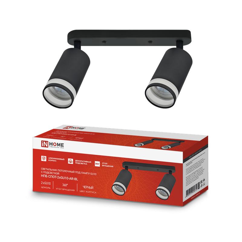 Главная/ Каталог / Светильники / Светильник накладной потолочный и настенный / Светильник НПБ СПОТ-2xGU10-AR-BL 55х165х260мм потолочн. под лампу GU10 черн. IN HOME 4690612045610