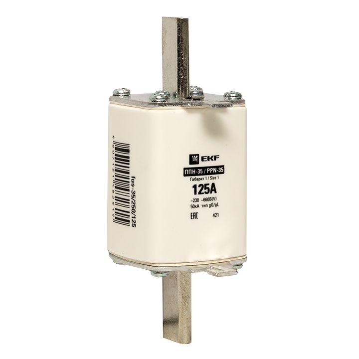 Плавкая вставка ППН-35 250/125А габарит 1 EKF. Предохранители плавкие ППН EKF, укомплектованные плавкими вставками типа gG/gL, предназначаются для защиты кабельных линий и промышленных электроустановок от токов перегрузки и короткого замыкания. Предохранители применяются в электрических сетях переменного тока частотой 50 Гц с напряжением до 660В. Применяются для крепления в распределительных и вводно-распределительных устройствах. Предохранители плавкие ППН могут устанавливаться в основание с держателем, а также в специально предназначенные рубильники. В комплект поставки предохранителей плавких ППН основание с держателем не входит и приобретается отдельно.