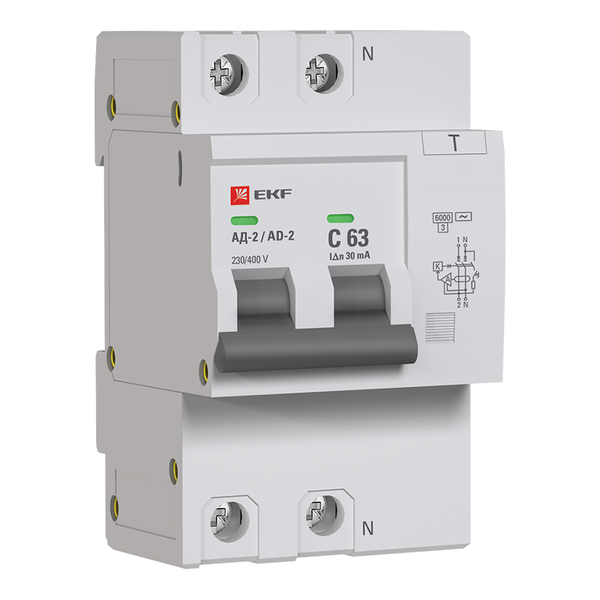 Выключатель автоматический дифференциального тока C 63А 30мА тип AC 6кА АД-2 (электрон.) защита 270В PROxima EKF DA2-6-63-30-pro